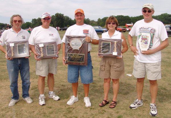 Top award winners at the 8th Annual Fred Gibb Memorial (open) Car Show were from left: Les Baer of Hillsdale with his 1969 Boss 429-BEST FORD; Denny Miller, Bettendorf, IA, with his 1969 Camaro SS Convertible-BEST GM; Jeff Halterman of Macon, Missouri with his 1967 Nova Promod Car-BEST OF SHOW; Karen Foutz of Hillsdale with her 1970 Plymouth Hemi Cuda won BEST MOPAR; and Kevin DeWitte of Fountain Hills, Arizona who brough a Fred Gibb car, a 1966-427 Chevy Impala-LONGEST DISTANCE.