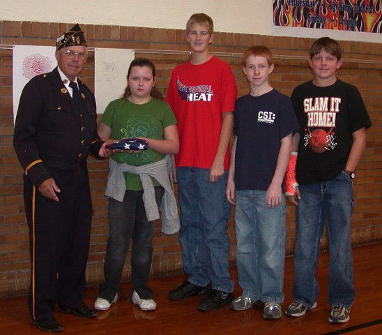 During a special Veterans Day ceremony Friday, Novemer 10, 2006, Dale Anderson of the Henderson County American Legion presented a new United States of America flag to students at West Central Middle School to replace the one that flies in front of the school in Stronghurst.