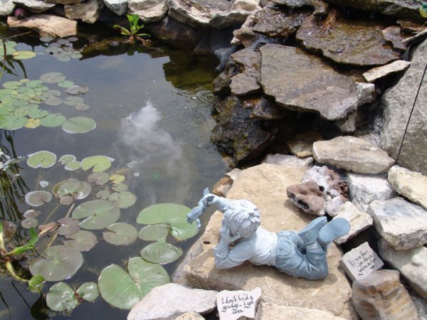 Her garden has water coming out of an antique hand pump, and a teapot, as well as the circulating water fall. There are several statues including "Ellie Mae" fishing, a fairy, a girl with a flower, another with a harp, and an adorable little boy on his stomach holding the leg of a frog.
