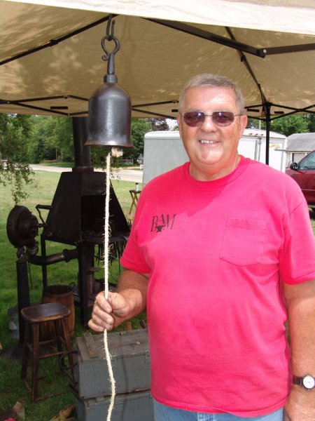 There were candelabras, camp fire sets, garden tools, a pot and pan rack for the kitchen, and several unique pieces like this dinner bell or " ship's" bell that he has displayed here in the above picture.