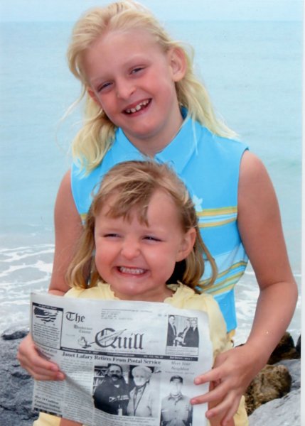 The Quill traveled with Joni (8) and Carley (4) Lafary to Florida from February 2nd-16th. They visited the Magic Kingdom and MGM Studios in Orlando the first week. Then they traveled south to Venice FL where they enjoyed sunshine, swimming, and the ocean. Joni and Carley belong to Marty and Lisa Lafary. Grandparents are Janet and the late Ralph Lafary and Wanda (Bud) Fillman and the late Delwin Holford. The girls took the Quill that had their grandmother Janet's retirement picture and story on the front page, who was a postal carrier in the Media-Smithshire area for 36 1/2 years. When you go on a trip, take The Quill along and take your picture with it and send it to us. Let us see where The Quill can go. |