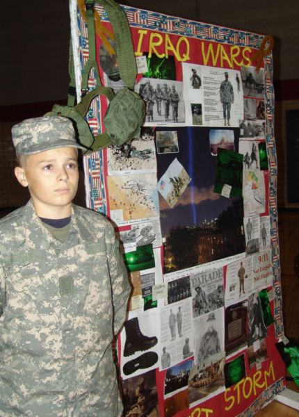 West Central Middle School 8th Grader, Ethan Bigger stands before one of the displays of the various wars during ceremonies prepared by West Central 6th, 7th, and 8th grade students and staff.