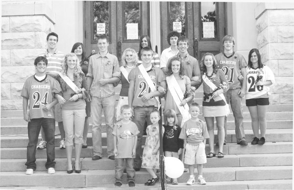 The full 2007 Illini West High School homecoming court includes, in front, from left to right, aisle runners, Carter Willdrick and Sheridan Taylor, and crown bearers, Megan Althar and Mason Burling. Second row, king Skyler Pence and queen Shelby Bartlett. Next row, first attendants, Sabe Goetz and Morgan Mohr; third attendants, Kellum Fecht and Lindsey Pollock; second attendants, Lance Holtsclaw and Alex Art; fourth attendants, Matt Snyder and Hannah Bess; back row, fifth attendant, Amber Jacoby, with escort, Justin Neally, 2006 Carthage High School homecoming king; and Hannah Brown and Tyler Sharpe, 2006 LaHarpe High School homecoming queen and king. -photo courtesy Hancock Journal Pilot