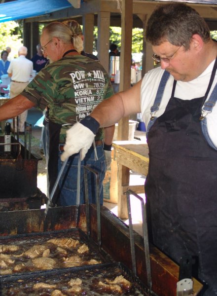 Dee Holford, Gladstone, turns carp at the right moment to help prepare a delicious meal for Henderson County Republicans Sunday. He has been helping fry fish at Democrat and Republican frys since he was 24, the year after C.E. Neff died 20 years ago. Ron Bigger leads the crew and follows Tag Olson and Rick Jarvis in creating large batches of delicious fish and chicken. This year, 300 lbs of catfish, 200 lbs of carp and 200 lbs of chicken were served up to Republicans. Veteran Bob Davis, of Oquawka is assisting. Work began at 7:30 a.m. |