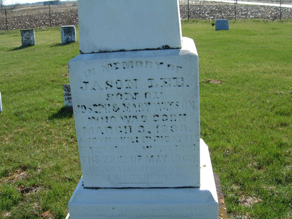 It reads "In Memory of son of Joseph and Mary Watson who was born Mar. 9, 1839 and was killed in battle at Vicksburg, Miss, May 22, 1863. He sleeps in a Patriots Grave where he fell, a Martyr for his country."