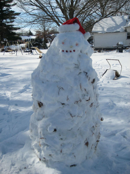 Meet Your Snowman Mikie, created on Friday evening December 28, 2007. His creator was Nathan Palmer at Uncle Mike and Aunt Virginia Palmer's house in La Harpe. Mikie took about a half an hour to make and he stands 7 feet tall and about 2 feet around. He has an extra coat of leaves to keep him warm in this very cold weather. His facial features are quite unique, his eyes are made of carrots and his nose is made of celery. Mikie's beautiful smile was created by cranberries. To make his creation complete Nathan tied a scarf around his neck and a santa hat to keep him warm. Nathan said he had fun creating Mikie, for his dad, Jason, and his Uncle Mike helped with Mikie's creation too. If the weather stays cool you can see Mikie on Center Street in La Harpe. |