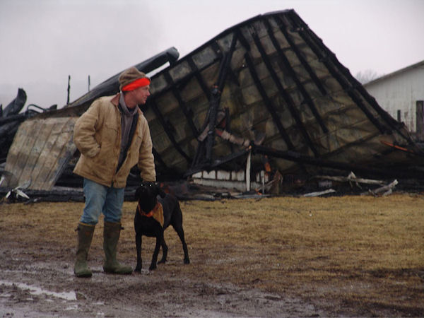 Mitch Lefler of rural Stronghurst comforts his 4 year-old Labador Retriever "Max," whose sleeping quarters in a "hog barn" was stolen from him in a Monday evening fire.