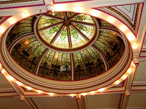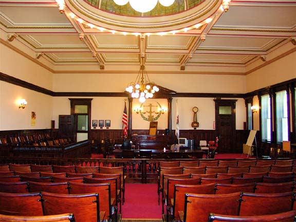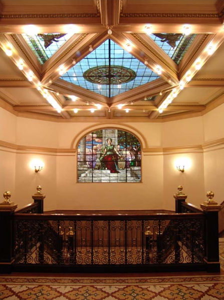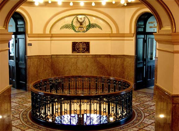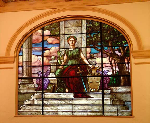 The large rotunda in the center of the courthouse leading up to the dome is of fish scale art glass, as is the smaller rotunda in the main courtroom on the third floor. A colored art glass depiction of Miss Justice is on the landing between the second and third floors on the east side and catches the morning sun. There is stained glass in the ceiling in front of Miss Justice, and half circle stained glass windows in the county board room and in the hall to the State's Attorney's office.