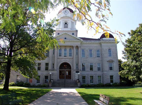 The third courthouse is a beautiful three story structure made of white Bedford stone from Indiana. It was originally topped with a roof of red Spanish tiles but has since been replaced with regular shingles. The two side entrances on the east and west are at ground level, while the north and south entrances have steps that enter the courthouse on a landing between the first and second floors.