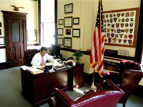 On top of the courthouse dome facing south is an 8 foot statue of Miss Justice, made of zinc and holding the scales of justice in one hand and a sword in the other, hoping that justice prevails in the rooms below.