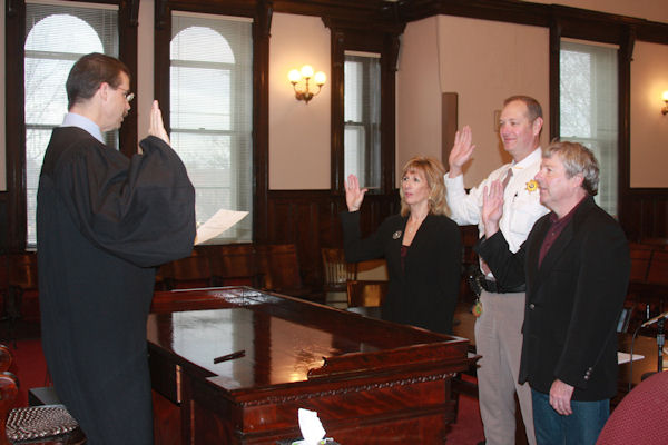 Hancock County Treasurer Kris Pilkington, Hancock County Sheriff John Jefferson, and Hancock County Clerk Kerry Asbridge are being sworn-in at the courthouse in Carthage by the Honorable Judge Richard Gambrell December 1st, 2010. -Courtesy photo by Vernon Dale Bolton, Hancock County Supervisor of Assessments