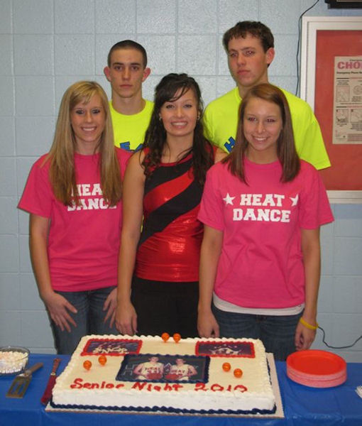 Five West Central seniors pose with cake Wednesday night as they were honored after the last home basketball game. Mallory Nelson, Kayla Hinshaw, Shelby Crawford, Dalton Johnson, Drew Postle will all go to 4-year colleges.