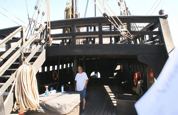 Sally said the replica was made for the movie "1492" on the 500 year anniversary, and she was asked to be a part of the crew. As the ship was finished in 1992, Sally said they made a long first voyage right off the dock in Brazil and into the sea for 27 days to Venezuela, then through the Panama Canal and up the coast of Costa Rico and they did the movie "1492" as Sally enjoyed the beaches there.