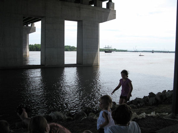 Children played along the Mississippi riverbank under the Big River Bridge as replicas of the Pinta and the Nina arrive on time Thursday, at 2:00 p.m.