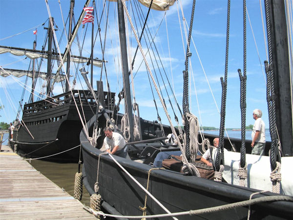 The crew on the Nina and Pinta get busy as the two boats dock to get everything ship shape for inspection so the public could tour the boats over the weekend.