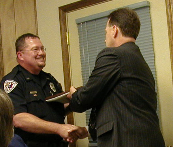 Chief of Police Gary Smith presented State's Attorney Ray Cavanaugh with a plaque of appreciation from the village board and the Stronghurst Police Department. Cavanaugh has been appointed as an associate judge in the Ninth Judicial Circuit. Chief Smith thanked Cavanaugh for all the help he gave in setting up the Stronghurst Police Department.