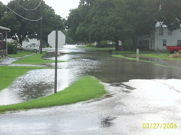 The tornado warning Monday evening brought the rain - again - with some hail and strong winds through northern Hancock County and for the most part La Harpe saw a lot of rain and a short period. This is 1st Street in front of John Pence's home.