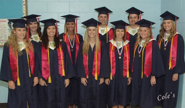 Mr. Phillip Geiser, Retiring Principal recognized the top ten scholars in the graduating class of 2010 at West Central. The top ten are: Erin Suerrette Bavery, daughter of Floyd Bavery and Ms. Susan Bavery; Ashli Morgan Burg, daughter of Mr. and Mrs. Brent Burg; Shelby Leah Crawford, daughter of Mr. and Steven Crawford; Justine Nichole Dillard, daughter of Mr. and Mrs. Scott Dillard; Kayla Mae Hinshaw, daughter of Ms. Nancy Hinshaw; Kendra Denise Kelly, daughter of Clark Kelly and Denise Jones; Michael Alfred Lawrence Lewis, son of Mr. and Mrs. Kirk Lewis; Luci Ann Lox, daughter of Mr. and Mrs. Jeff Lox; Mallory Nicole Nelson, daughter of Mr. and Mrs. David Nelson; and Andrew Scott Postle, son of Mr. and Mrs. Scott Postle.