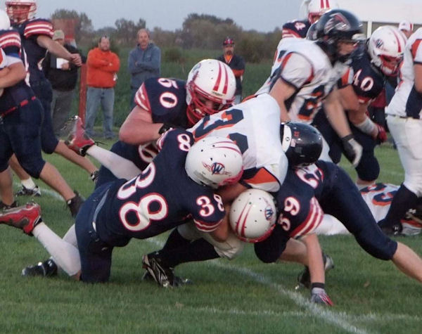 The West Central Varsity puts the Heat on the Falcons with Heat #38 Chris Cooper, #50 Dustin Hawk, #39 Tyler Anderson, and #40 Toby Krow in on the action to quench their chances of scoring Friday evening at the Heat's first home opener and second win of the 2010 football season. -photo courtesy of Cole Photography
