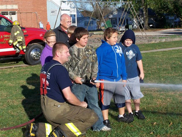 La Harpe Firemen were at the school during National Fire Prevention Week Oct. 9-15, talking and demonstrating to students many lifesaving fire safety tips. As part of the activities, students went through the portable fire house, and later enjoyed holding the fire hose, feeling the pressure available to put out the large flames that fire can produce so rapidly.