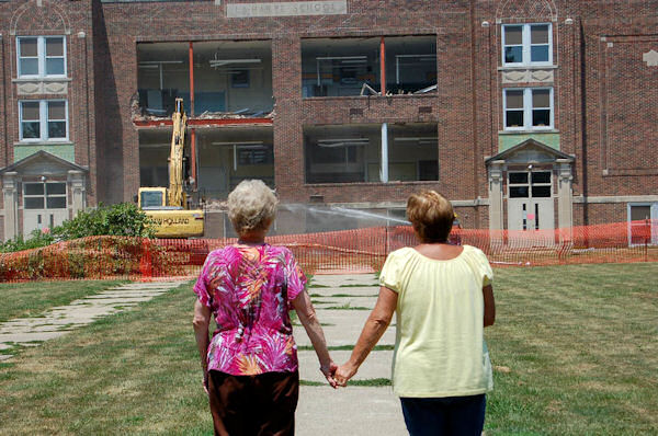 July 13, 2012 class mates of LHS and friends over the years watch the end of an era and hold on to the many memories they share. Saying "good-bye" from left are Bette June (Rice) Mapes and Kay (St Clair) Olson of La Harpe. The empty school is being torn down to enable space for new construction.