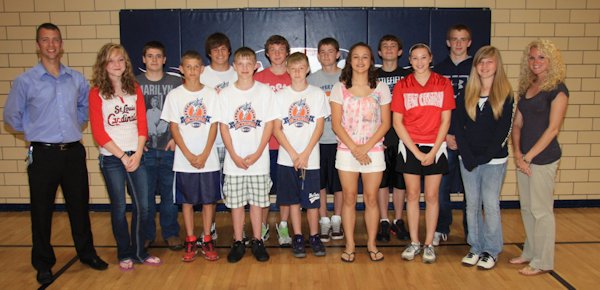 Back Row: (left to right) Jordan Sells- 7th Grade Boys Shot Put, Zak Spiker- 8th Grade Boys Shot Put, Brent Nichols- 7th Grade Boys 4x200 meter relay, 7th Grade Boys 4x400 meter relay, 7th Grade Boys Long Jump, Zach Vancil- 7th Grade Boys 4x200 meter relay, 7th Grade Boys 4x400 meter relay, 7th Grade Boys 400 meter dash, 7th Grade Boys Long Jump, James Porter- alternate for 7th Grade Boys 4x400, Curtis Nichols- 8th Grade Boys Long Jump.