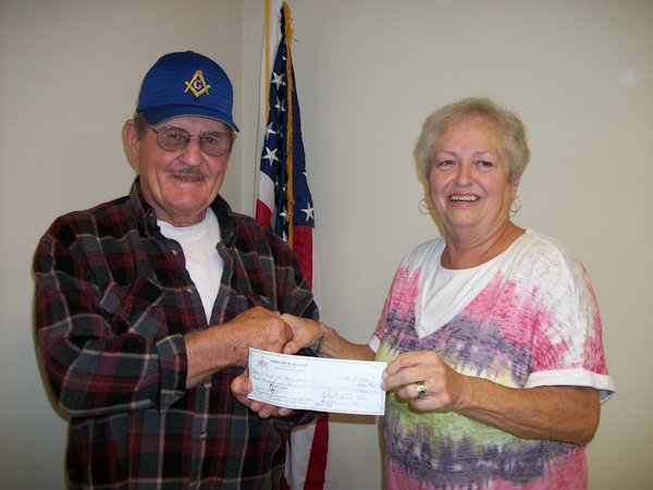 Newman "Woody" Hawks is seen here presenting Oquawka Village Clerk Sandy Huff with a check for $500.00, to be used for Playground Equipment for Small Children. Hawks and Al Livingston of Oquawka Masonic Lodge #123, gave the check from the Pennies for Children Fund of the Masonic Lodge. Hopefully, this amount will be matched by the Masonic Grand Lodge of Illinois, located in Springfield. The presentation was made prior to Monday night's Oquawka Village Board meeting. Photo Sally Day/The Quill