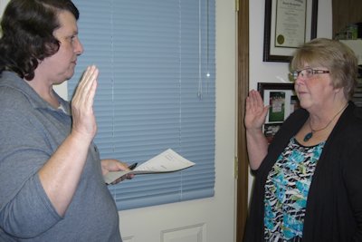 Lou Ann Nortrup, Village Clerk, swears in the newest elected officials on the Stronghurst Board: Mayor Gary Root and Trustee Betty Waterman.