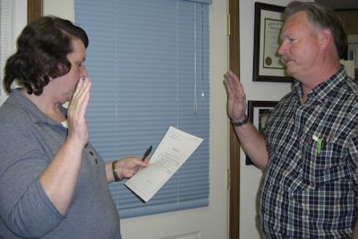 Gary Root was sworn in as mayor of Stronghurst by Clerk Lou Ann Nortrup at the May 6th village board meeting. Betty Waterman and Mike Bohnenkamp also took the oath of office as trustees. David Vancil, the other trustee, to win the election was not present to be sworn in.