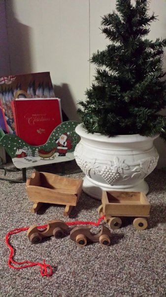 Today, you will find inserted into the paper "The Gift Of Christmas" our 2013 Christmas book. If you look on page 32 of the 64 page book, you will find a story entitled "The Toymaker" a true story written by Don Young of Ohio. Don worked along side Billy Graham during his crusades and he has recently retired as President of a Christian College in the Carolinas to do evangelism and help churches. He has done work in the area and has supported our Christmas book with many stories. Tuesday morning, he stopped in and left a Christmas gift for me. It is the neatest gift I've ever received from one of God's servants - The Toymaker. It is four hand carved toys: a cradle, two race cars and a little wagon with bright red yarn to pull it with. You will need to read the story on page 32, to see just how special he is. -Dessa Rodeffer