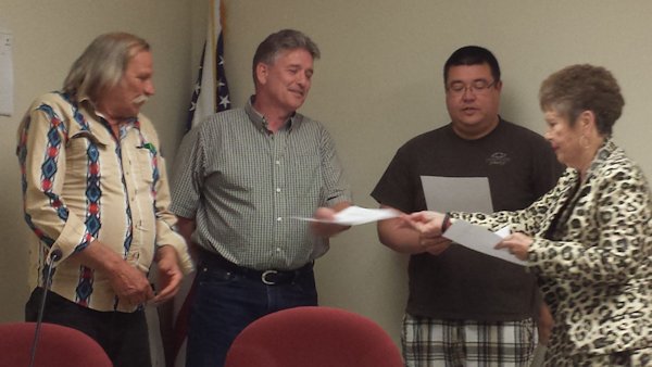Newly elected Leo Kuberski, and re-elected Scott Ray and Robert Eldridge are being handed information by Mayor Sandra Fullerton-Moody at swearing in as Oquawka Village Trustees.