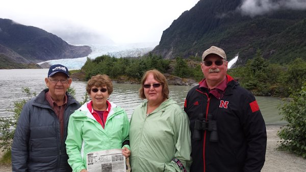 Gene and Theresa Fox, Kathy and Jerry Keimig, all of Stronghurst, took the Quill along on their trip to Alaska They are at the Mendenhall Glacier, Juneau, AK
