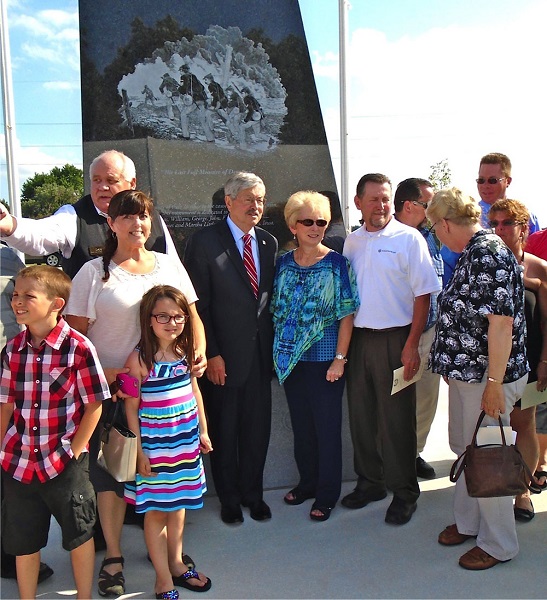 Iowa Governor Terry Branstad gathers in front of the newly dedicated monument with the Littleton family decendants. (photo by Deb Olson)