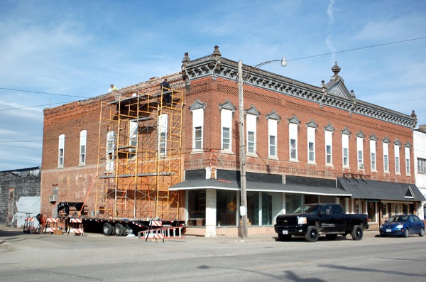 Bette June Mapes was out and about in La Harpe on a beautiful sunny February 29, 2016 "Leap Year" day and photographed a crew of workers taking advantage of the warm sunny weather. It was 60 + degrees. This is the Campbell building which is owned by Colton Foster of La Harpe. Colton and his crew were replacing and repairing bricks that had fallen from the top edge of the west side of this beautiful historic La Harpe building. It is really looking nice, Bette said.
