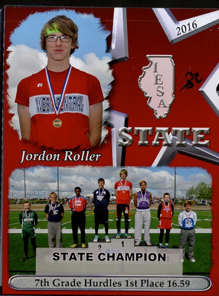 Jordon Roller, a 7th grader at West Central Middle School, shown brightly in state competition as he brought home the top medallion in the 7B contest, flying over 110 meters of hurdles in a time of 16.59s, making him the 2016 1st Place Illinois State Champion!