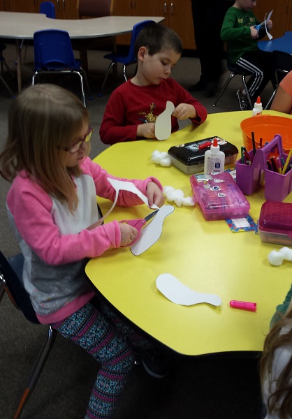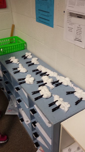 As part of their sheep lesson, the children then got to make their own sheep from cardstock, cotton balls and clothes pins. They cut out the outline of the sheep’s body and ears from the cardstock, then glued the ears to the sheep’s head. They fluffed up cotton balls and glued them to the sheep’s body. Black clothespins were attached giving the sheep legs.