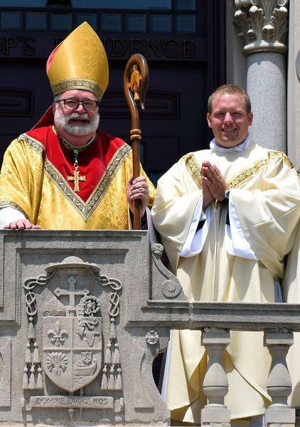 Newly ordained Father Lee Brokaw, of Raritan, poses with Bishop Daniel R. Jenky, CSC, for the traditional photo on the steps of the Bishop's Home after the Mass of Ordination.