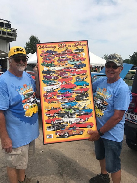 At the annual La Harpe Classic Car Show and Reunion, twenty years of memories are depicted on this special plaque that co-organizers Bob Lionberger (left) and Kenny Brown (right) are holding during a hot but very successful event.