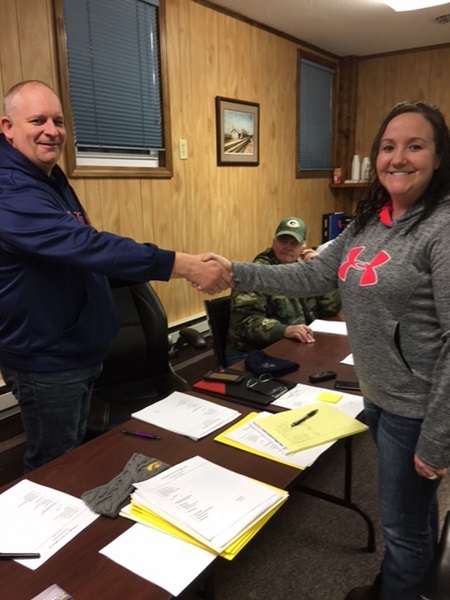 Mayor Brendan Schaley congratulates Holly Allen Monday evening after her swearing in as Clerk/Treasurer for the Village of Stronghurst.