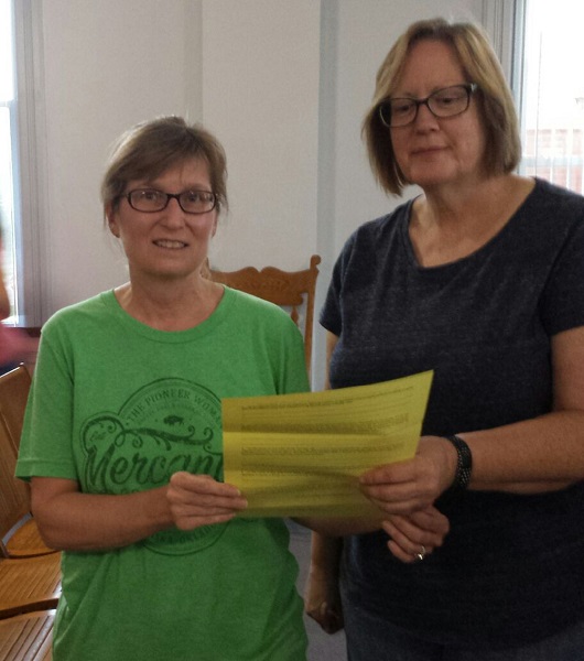 Kelly Harkey (left) is being sworn in as Alderwoman at the La Harpe City Council Meeting Monday evening by City Clerk Lucretia McPeak.
