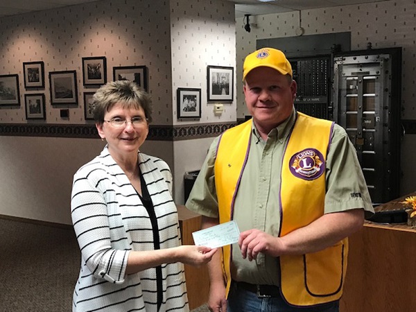 Mike Lionberger, President of the La Harpe Lions Club, is pictured presenting a check to Jeanette Ford, Vice President/Banking Center Manager at Fortress Bank, La Harpe Office, for the Christmas Gift Tree located in the lobby of the La Harpe Office.