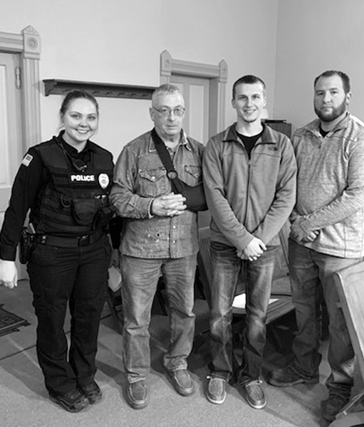From left, Marlie Burt, Police Chief Larry Finch, Austin Myers, and La Harpe Alderman Brian Covert gather after the La Harpe Council hired Austin as part time La Harpe Police Officer.