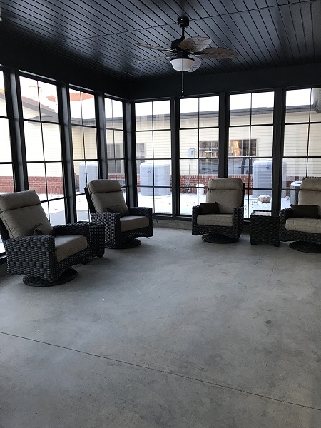 The addition adds ten new residences, including both singles and doubles and handicap accessible, a beauty shop, a game room with an entrance to the glass enclosed patio and a new central bath.