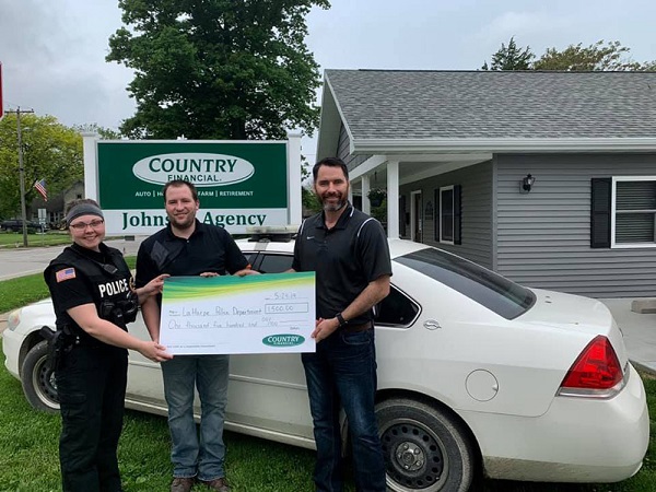 Pictured from left is Marlie Burt, La Harpe Police Department, Brian Covert, La Harpe City Council, receiving the check from Ryan Johnson.