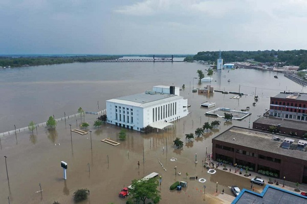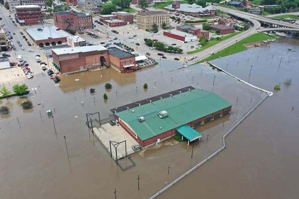 Prior to the Mississippi River's predicted crest Saturday, June 1st, waters pushed through Hesco barriers near the lift station which collasped south of the Burlington, Iowa Memorial Auditorium at 1:30 p.m. Within about 20-30 minutes waters surrounded the auditorium and Port of Burlington building, and into the parking lots of the Drake and covering Front Street causing issues at the on-ramp onto the Big River Bridge and US 34 eastbound lanes. According to reports by city officials, the recent heavy rains had saturated the sand in the barriers which contributed to the breach.