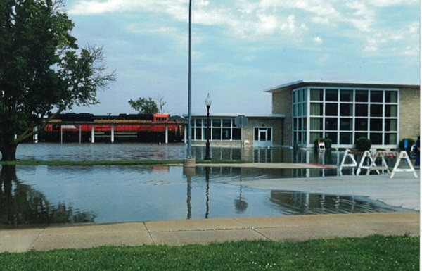 The Burlington Depot area is flooded yet trains were running both ways according to Larry Sterett who took this photo shortly after the breach.