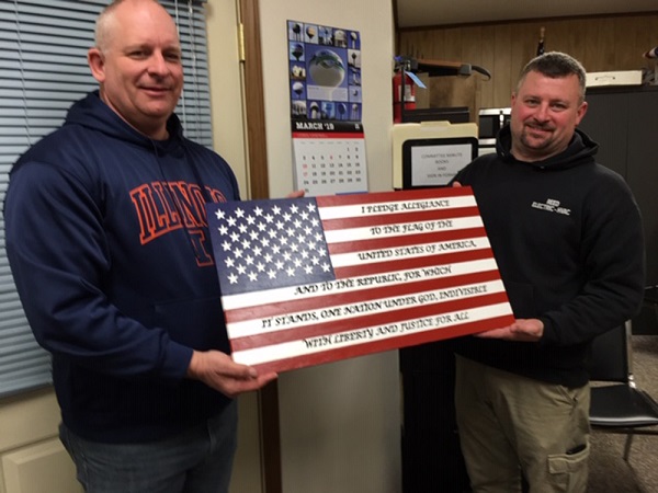 Stronghurst Village Mayor Brendan Schaley (left) and board member Shane Reed show the gift presented to the village by Chris Cooper of MSA Engineers in recognition of the "Pledge of Allegiance" Schaley revived at the meetings.