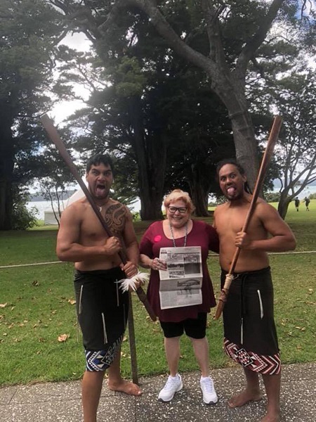 The trip was a chance of a lifetime and incredible! Sally is seen here (with the Quill), with two men from the Maori tribe in Waitangi in the Bay of Islands in New Zealand.