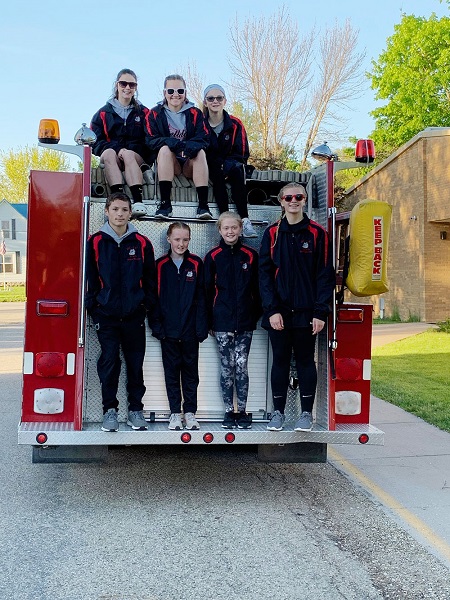 Competitors posing on the back of the fire truck: Top row (L-R): Alisha Payne, Rachel James, and Ali Lopez. Bottom row (L-R): Shawn Watkins Jr, Natalie Wibbell, Grace Goettsche, and Olivia Johnson.