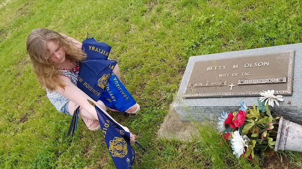 Lainey Guyton places a Ladies Auxiliary flag honoring Betty Olson.
